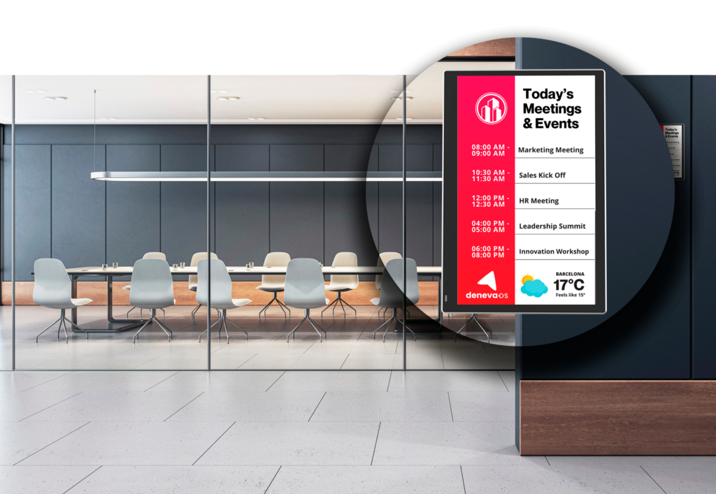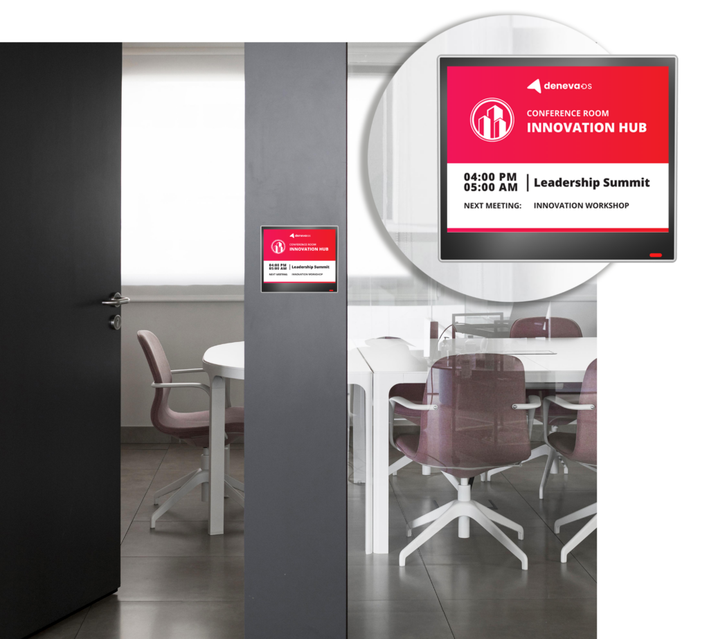 DENEVA allows you to schedule and display content across all QBIC-enabled displays, including meeting room screens, from a single interface: