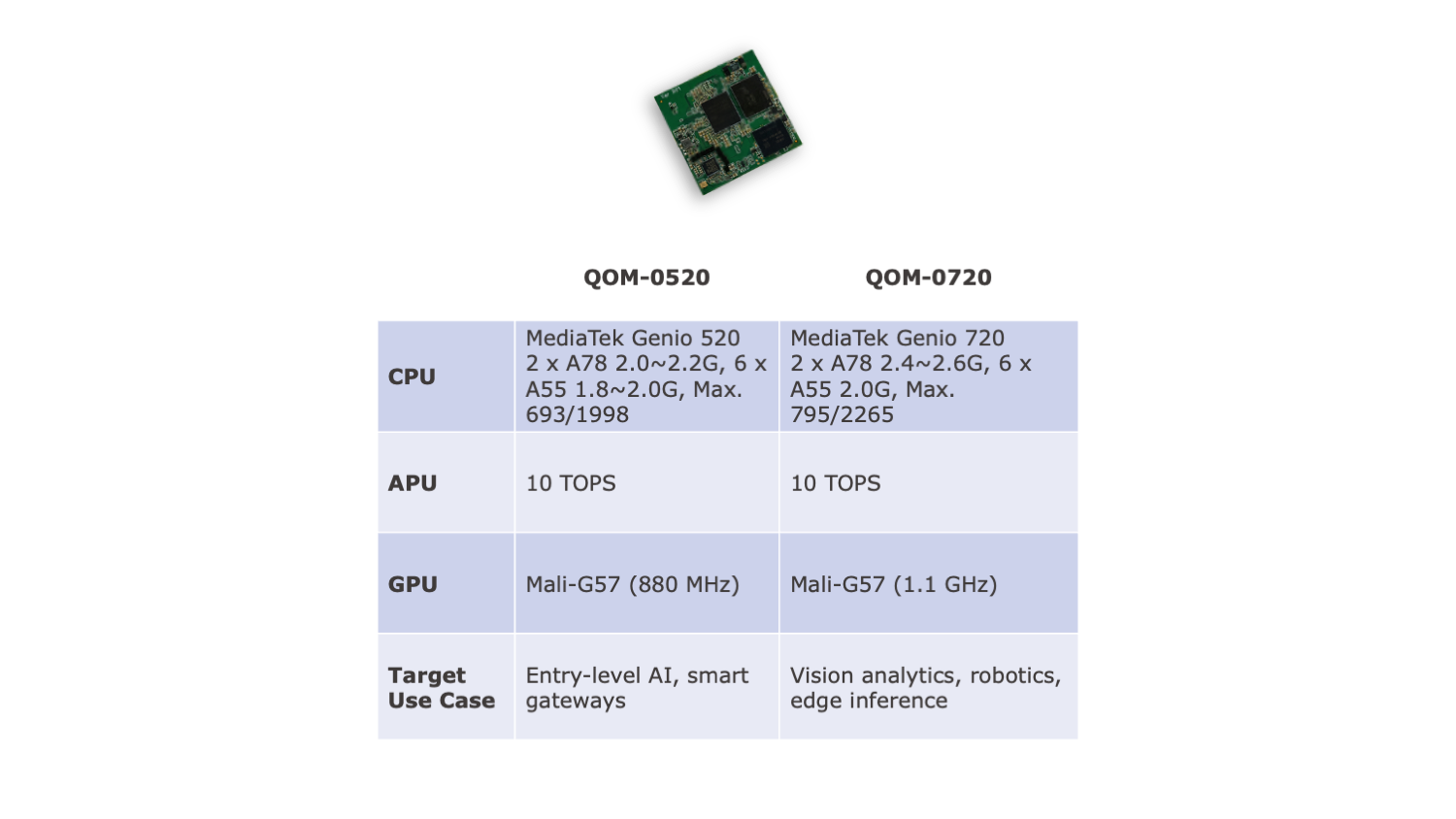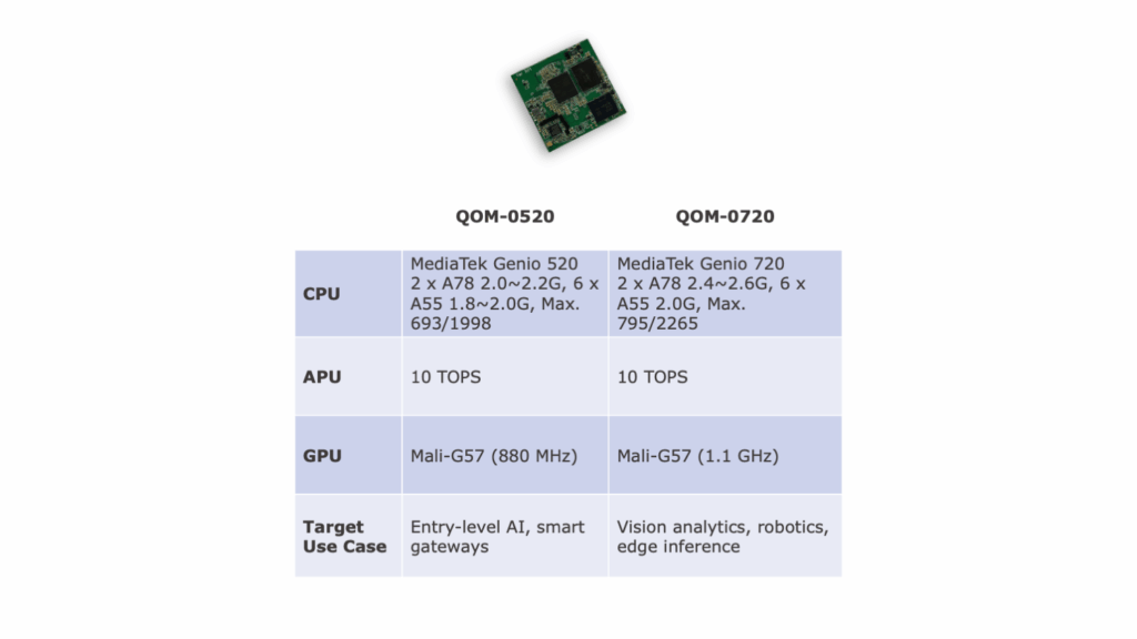 Harnessing the MediaTek Genio 520 / 720 SoC, this Open Standard Module (OSM) integrates Arm Cortex CPUs, a Mali-G57 GPU, and a Gen 8 APU. It delivers up to 10 TOPS of AI performance, making it ideal for demanding workloads like intelligent vision, predictive analytics, and generative AI at the industrial edge. Optimized for compact deployments—smart retail, factory automation, AI signage, HMI—it significantly